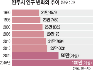 사통팔달, 중부 내륙 성장거점 도시로 떠오르는 강원 원주시의 행보가 거침없다. 올해부터 2021년까지 경기 여주~원주 간 수도권 전철, 경기 광주~원주 간 제2 영동고속도로, 중앙선 고속화철도, 원주~강릉 간 복선전철 등 광역교통망이 속속 개통된다. 지역 발전의 주요 축으로 자리잡은 혁신도시와 ‘지식기반 기업도시’의 성공적인 안착도 도시 규모를 키우고 있다. 관광객 연간 300만명을 끌어들일 화훼특화관광단지 조성과 함께 ‘관광레저형 기업도시’ 유치를 성사시키면 수도권 배후의 거대 도시로 탈바꿈할 수 있다. 2018 평창동계올림픽은 평창과 강릉이 무대지만, 복선철도 등 인프라 구축의 혜택은 원주시가 가져간다는 평가다. 인구도 현재 33만 7800여명에서 10년 내 50만명, 30년 내 100만명으로 증가한다는 전망도 나온다. 이런 원주 팽창의 중심에 도시공학을 전공한 건축사 출신 원창묵(56) 시장이 있다. 재선 시의원 출신답게 시정을 속속히 챙긴다. 지난 16일 원주 토박이 원 시장에게 원주의 청사진을 들여다봤다.
