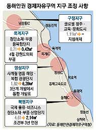 22일 강원도에 따르면 동해안권 경제자유구역은 2013년 2월 14일 강릉시와 동해시 일대 구정·옥계·망상·북평 등 4개 지구 8.25㎢ 규모로 지정됐다. 동해 망상지구는 사계절 명품 해양·복합 관광도시 조성을 콘셉트로, 북평지구는 비철금속 첨단부품산업과 물류비즈니스 국제복합업무도시로, 강릉 옥계지구는 마그네슘·티타늄·리튬 등 첨단소재융합산업도시로, 강릉 구정지구는 국제기준에 맞는 외국인 주거와 교육도시로 건설하겠다는 계획이었다.