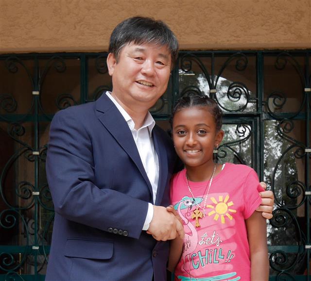 최문순 화천군수가 2015년 에티오피아 아디스아바바를 찾아 참전용사 후손으로 초등학교 2학년인 티시낫메누어에게 장학금을 준 뒤 기념 촬영을 하고 있다.