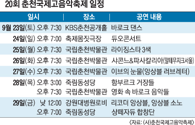 20일 춘천시와 사단법인 춘천국제고음악축제에 따르면 올해로 20회를 맞는 춘천국제고음악축제가 오는 23일부터 29일까지 7일 동안 국립춘천박물관, 축제몸짓극장, 죽림동성당 등에서 열린다.