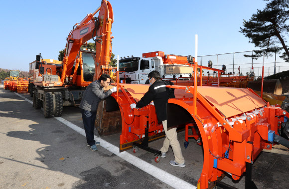 대설(大雪)인 7일 강원도 강릉시청 직원들이 2018년 평창동계올림픽 제설에 사용할 각종 장비를 점검하고 있다. 앞서 강릉시는 동해안의 겨울 폭설로부터 올림픽 시설을 지키기 위해 제설 경력이 출중한 베테랑 공무원으로 구성된 제설팀을 꾸렸다.