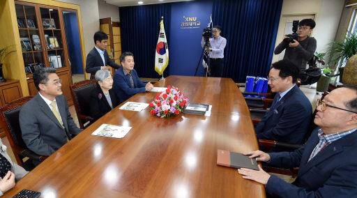 강원대 김헌영 총장과 조준형 부총장은 전날 강원대 총장실에서 최근 방한한 북한 평양과학기술대 고동훈 교무부총장, 김필주 농업생명과학부 학장 등과 두 대학 간 교류협력 방안을 협의했다.