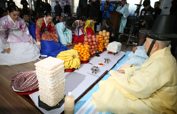설 명절을 맞아 6일 강원 강릉시 위촌리 마을 전통문화전승관에서 주민들이 어르신들께 합동으로 세배를 드리고 있다.