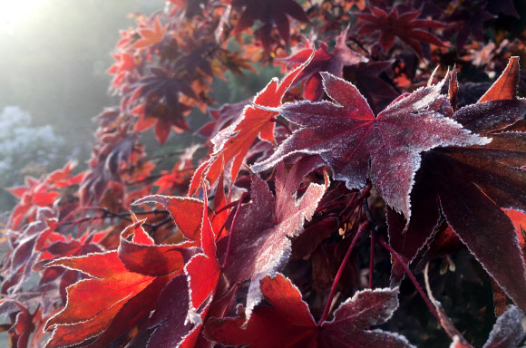 강원 내륙 지역의 아침 최저기온이 영하 3.4도까지 떨어지며 한파주의보가 발효 중인 30일 오전 철원군 갈말읍 토성리의 단풍 위로 서리가 내려앉아 있다.