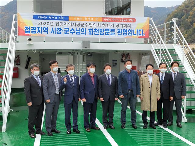 2020년 접경지역시장군수협의회 하반기 정기회의가 21일 강원 화천군 평화의댐 일원 및 선상회의실(물빛누리호)에서 열렸다. 회의에서는 접경지역 지원 특별법 개정 등이 논의됐다. 오른쪽부터 고성군 문영준 부군수, 파주시 김회광 부시장, 인제군 최상기 군수, 연천군 김광철 군수, 양구군 조인묵 군수, 화천군 최문순 군수, 김포시 정하영 시장, 옹진군 오영철 부군수, 강화군 이응길 부군수.
