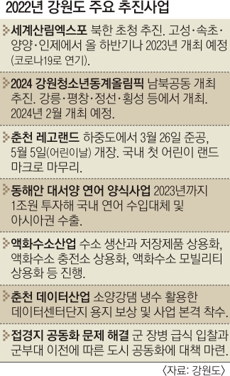 “금강산 관광이 중단되면서 속초·고성 지역의 경제적 피해가 크다. 지역의 사회적 문제까지 이어지고 있어 안타깝다. 설상가상 코로나19 장기화로 상황은 더 안 좋다. 고성을 찾던 관광객들이 연간 200만명 정도 감소했다. 경제 손실도 연간 약 3600억원에 이른다. 실업에 따른 인구 유출, 조손 가정 발생, 관광사업체 폐업 등 지역의 산업기반이 무너졌다. 복잡한 국제관계로 금강산 관광 재개가 쉽지 않지만 강원도에서 할 수 있는 장단기 과제를 구분해 준비하고 추진해 나갈 생각이다. 기존 금강산 등반, 저녁공연, 해금강 등에 한정됐던 관광코스를 마식령스키장이나 원산항, 원산관광특구까지 확대하고 크루즈를 타고 속초와 원산을 오간다거나 남한의 양양공항과 북한의 갈마공항을 이용하는 등 접근성을 입체화할 준비를 해 놓고 있다. 장기적으로는 설악권과 금강권 관광지를 연결해 ‘국제관광자유지대’를 조성할 계획이다. 외국인들이 무비자로 출입국할 수 있고 면세 등 다양한 인센티브를 마련해 앞으로 국제적인 관광단지로 조성해 나갈 생각이다.”