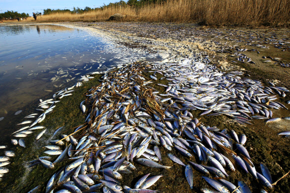 강원 고성군 바닷가에 붙어 있는 호수인 송지호에서 집단 폐사한 물고기들이 8일 오전 호숫가로 밀려나와 있다. 죽은 물고기는 대부분 전어로 수만 마리로 추산되며, 무산소나 저산소 현상 때문에 폐사한 것으로 보인다.