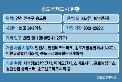 바다와 갯벌을 매립해 서울 여의도 면적의 17배에 달하는 53.36㎢ 규모로 조성되는 송도국제도시는 개발이 모두 끝나면 26만명이 거주하게 된다. 현재 인구는 12만 8565명(외국인 2953명 포함)이다. 미국 경제전문지 포천이 발표한 매출액 기준 글로벌 500대 기업 중 11개가 송도에 투자했거나 투자 계약을 맺었다. 유엔 아·태경제사회위원회(UNESCAP), 녹색기후기금(GCF) 사무국 등 15개 국제기구도 송도에 둥지를 틀었다.