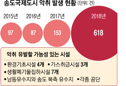 19일 인천시에 따르면 송도국제도시에선 2015년 97건, 2016년 87건에서 2017년 153건, 지난해 618건이나 되는 악취 민원이 접수됐다. 전년 대비 4배를 웃도는 데다 신고 지역이 송도 전역에 걸쳐 있다. 악취 관련 민원이 집중 제기되면서 송도 주민 온라인 커뮤니티에는 이사를 고려하고 있다는 고민까지 등장했다.