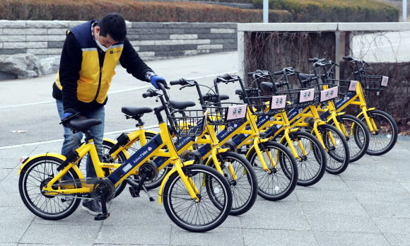 카카오의 공유 경제는 계속된다  6일 오전 인천 연수구 송도국제도시 센트럴공원에 ‘카카오T 바이크’가 배치되고 있다. 카카오T 바이크는 전국 최초의 공유 전기자전거로 ‘카카오T’ 애플리케이션으로 위치를 확인해 자전거에 부착된 QR코드나 일련번호로 인증한 뒤 목적지까지 이동하면 된다. 시간 제한이 없고 별도 거치대도 없다. 이용 후 잠금장치를 가동하면 요금이 자동으로 결제된다. 보증금은 1만원이며 최초 15분간은 1000원, 이후 5분에 500원씩 추가된다. 시범서비스로 연수구에 400대, 경기 성남에 600대가 배치됐다. <br>연합뉴스
