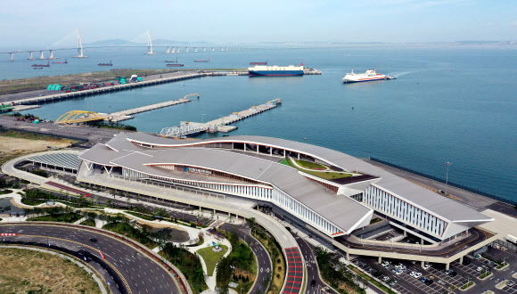 15일 오전 인천시 연수구 송도국제도시 9공구에 문을 연 인천항 신국제여객터미널에 첫 선박인 인천과 중국 산둥성 웨이하이를 오가는 위동항운 소속 카페리선 뉴골든브릿지 7호가 입항하고 있다. 기존의 낡은 제1·2국제여객터미널을 대체하는 이 터미널과 부두는 정부가 1400억원, 인천항만공사가 5305억원 등 총 6705억원을 투자해 건설했으며 중국 10개 도시를 연결하는 정기 카페리선이 운항된다.