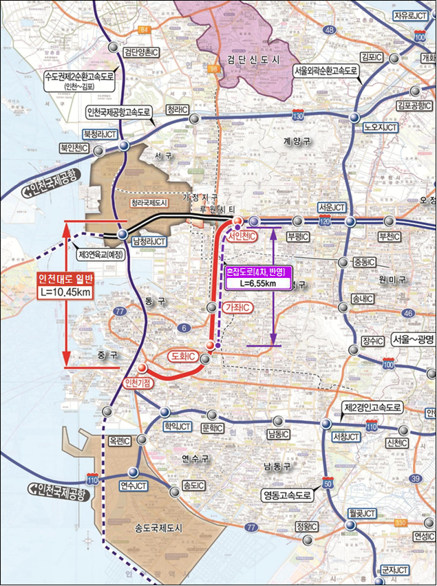 특히 인천대로 공단고가교~서인천IC 6.55㎞(지하도로 4.5㎞) 구간은 이번 교통혼잡도로 계획 반영으로 왕복4차로의 지하도로를 건설하는 사업이 탄력을 받게 됐다. 지하도로 건설은 인천대로가 시민 중심적이고 환경친화적으로 재생되는 데 핵심이 되는 사업이다.