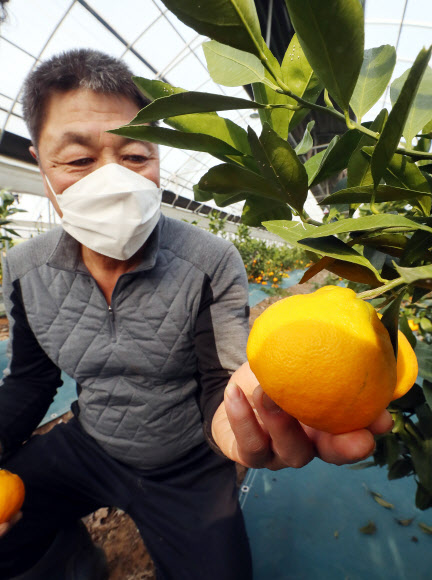 인천시 농업기술센터는 15일 인천에서 처음으로 감귤 재배에 성공해 첫 수확을 했다고 밝혔다. 계양구 선주지동의 한 농가는 2019년 비닐하우스 안에 감귤 묘목을 심은 후 첫 수확을 했으며 올해 수확량이 약 200㎏에 이를 전망이다. 센터는 이 농가에 기술 지도를 해 왔다. 농민이 주렁주렁 열린 감귤을 따고 있다.