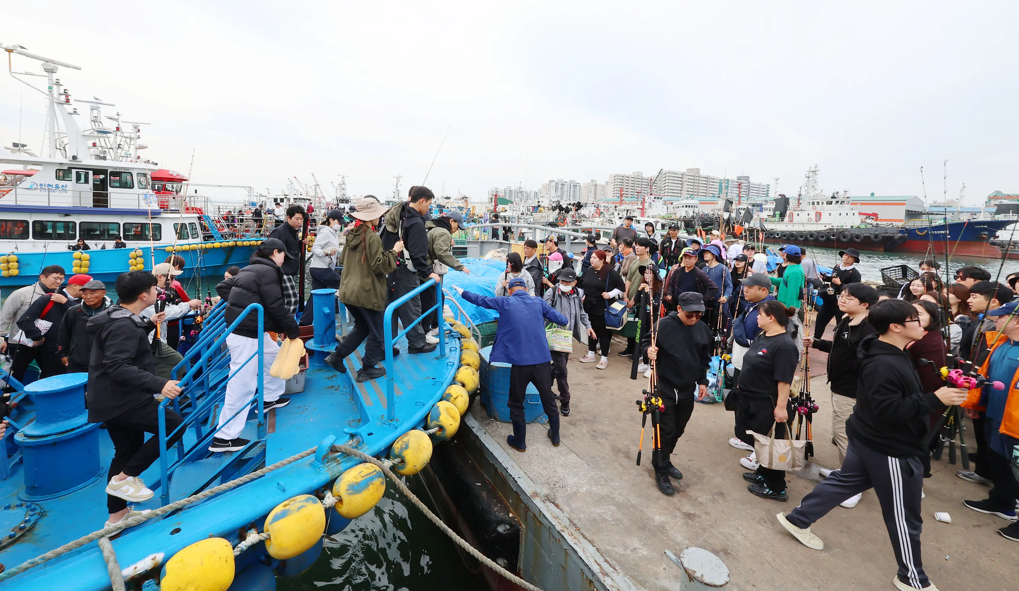 13일 오전 주꾸미 낚시꾼들이 인천 중구 남항부두 잔교 위에서 승선을 기다리고 있다. 5~8월 금어기 때 부화한 주꾸미들이 활동을 활발히 하는 가을철이 주꾸미 낚시 성수기로 손꼽힌다. 연합뉴스