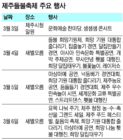 올해 제주들불축제는 ‘희망’을 주제로 축제 첫날인 3일은 희망이 샘솟는 날, 둘째 날은 희망이 영그는 날, 셋째 날은 희망이 번지는 날, 마지막날인 6일은 희망을 나누는 날 등 날짜별 테마가 있는 마당을 구성해 모두 68개의 갖가지 프로그램을 펼친다.