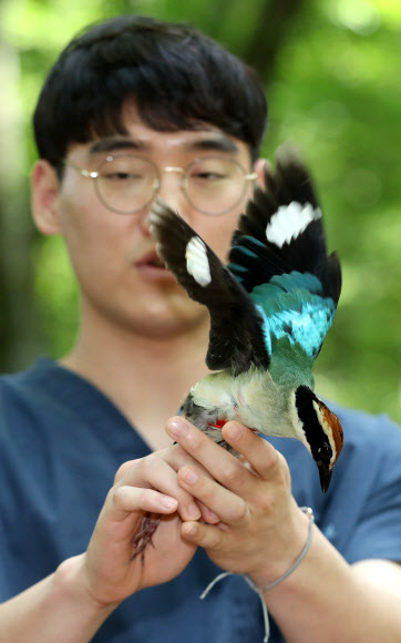 멸종위기종인 팔색조가 12일 제주시 오라2동 숲에서 자연으로 돌려보내지기에 앞서 제주대 제주야생동물구조센터 관계자의 손 위에서 날갯짓을 하고 있다. 이 새는 지난달 21일 제주항 인근에서 건물 유리벽에 충돌해 뇌손상을 입어 그동안 구조센터에서 치료를 받아왔다.