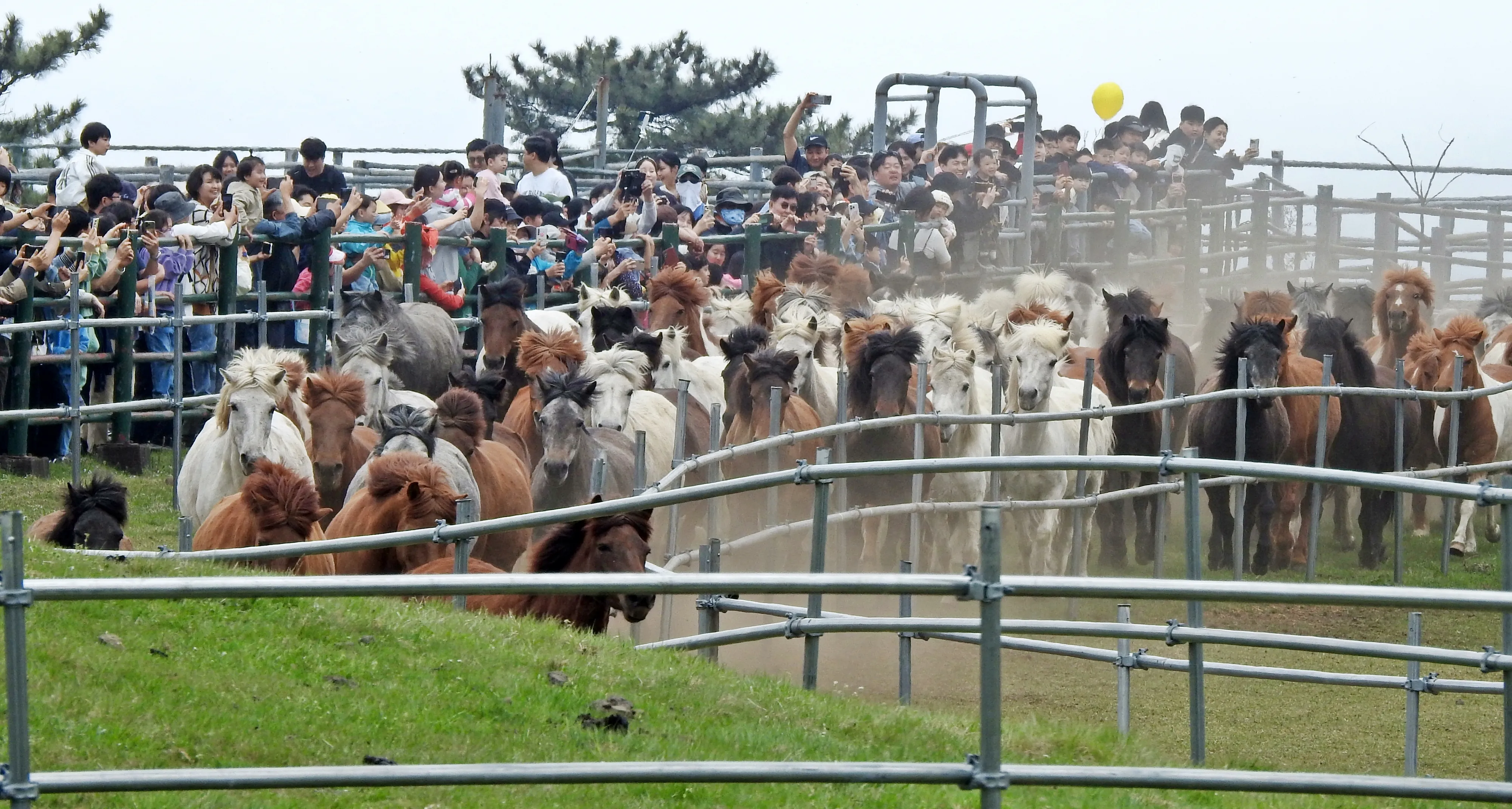 20일 오전 제주시 516도로 마방목지에서 열린 ‘2025 제주마 입목 문화축제’에서 천연기념물 제347호인 제주마 100여마리가 초원을 달리고 있다. 입목은 겨울 동안 마사에 있던 말이 봄이 되면 방목지로 옮기는 제주 고유의 전통 의식이다. 축제는 19일 개막해 이날 막 내렸다.