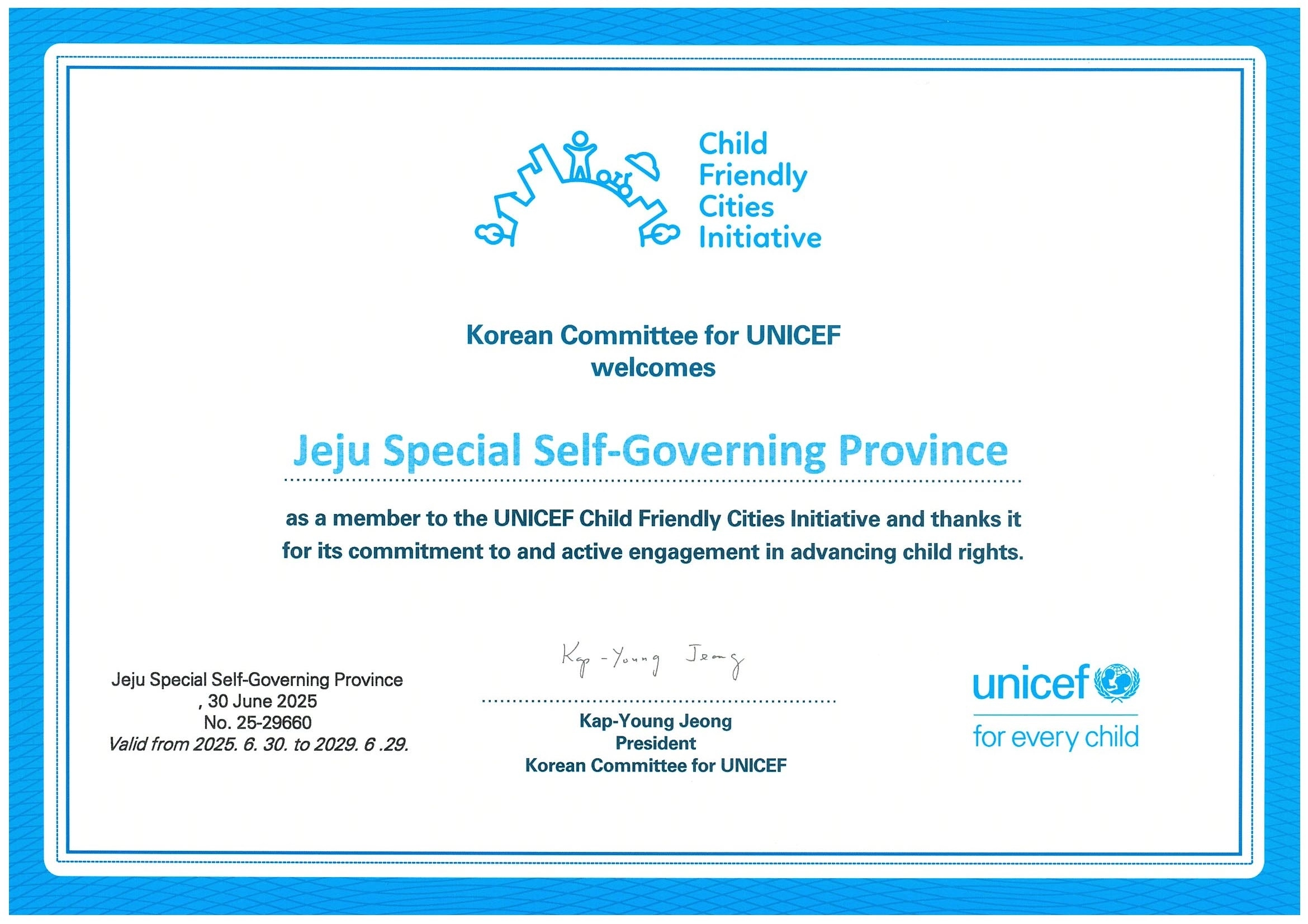 제주도가 유니세프 아동친화도시(CFC) 인증을 획득했다.