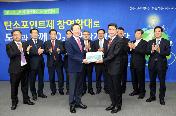 전북에 있는 9개 국가기관이 20일 전북도(도지사 송하진) 및 전북기후·환경네트워크(대표 김택천)와 도청 종합상황실에서 탄소포인트제 참여 확대를 위한 릴레이 협약을 체결했다.협약에는 전주보훈지청, 전북지방조달청, 전북지방우정청, 전북지방병무청, 전북지방중소기업청, 새만금지방환경청, 전주지방노동지원청, 익산지방국토관리청, 군산지방해양수산청 등이 참여했다.