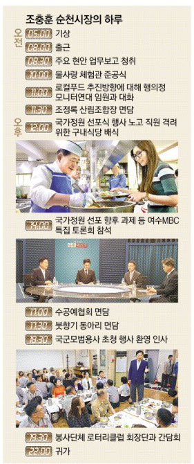 조 시장은 아랫시장 골목에 있는 자그마한 백반집인 ‘삼순이네’ 식당을 가장 좋아한다. 일정상 한 달에 두세 번밖에 찾지 못하지만 애호박찌개를 먹기 위해 이곳을 찾는다. 여섯 살 때 처음 먹은 고기가 애호박이 들어간 돼지고기 찌개였고, 이 식당이 어렸을 때 어머니가 해 주던 맛이 그대로 나기 때문이란다. 그는 점심 후 차량 이동 때 10여분 달게 쪽잠을 잤다. 직원들과 점심 식사를 마친 조 시장은 오후 일정으로 여수MBC 토론 ‘시사뉴스크’에 패널로 참석했다. 조 시장은 이 자리에서 국가정원의 중요성과 앞으로의 계획, 순천시 발전 방향 등을 제시하는 등 열띤 토론을 벌였다.