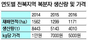 14일 전북도에 따르면 올해 도내 복분자는 1171㏊에서 4010t이 생산됐다. 예년 같으면 4936t이 생산됐겠지만 농가들이 상품만 수확하고 중·하품은 포기했기 때문이다. 20%가량은 버린 셈이다.