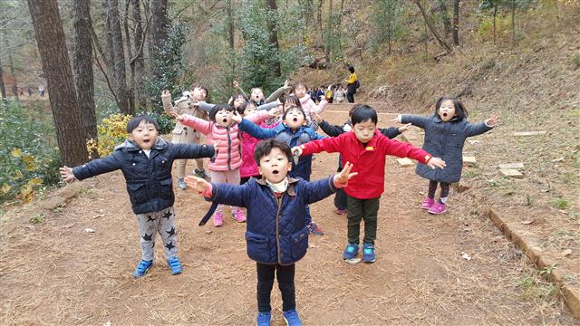 전남 광양시 옥룡면 백운산자연휴양림에 있는 숲 유치원에 참여한 유치원 어린이들이 자연과 함께하는 각종 놀이를 하면서 즐거워하고 있다. 숲 유치원은 숲 해설가의 안내로 아이들이 마음껏 뛰며 만지고 느끼며 스스로 배우는 자연체험장이다.