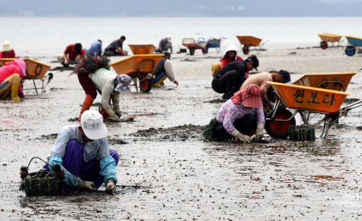 태안 앞바다서 바지락 캐기 한창 11일 충남 태안군 안면읍 황도 앞바다 갯벌에서 어민들이 바지락을 캐고 있다. 태안군은 내년 말까지 황도 앞바다 갯벌에 3억원을 들여 명품 바지락 단지가 조성할 계획이다. 태안=연합뉴스