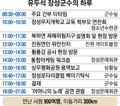 유두석(66) 전남 장성군수 부부는 모두 군수 출신이라는 이례적인 경력을 갖고 있다. 유 군수는 2006년 군수에 당선됐지만 선거법 위반으로 1년 6개월 만에 낙마했다. 하지만 보궐선거에서 남편의 뒤를 이어 중학교 교감 출신의 부인 이청(59)씨가 당선됐다. 이 부부는 민주당 아성인 호남 텃밭에서 모두 무소속으로 승리를 거머쥐었다. 2010년 부인이 무난히 재선에 오를 것이라는 예상과 달리 민주당 지원을 받은 후보에 밀려 낙선하고 4년 뒤 치른 지방선거에서 유 군수가 다시 군수로 복귀했다. 건설교통부 이사관 출신으로 도시 디자인 전문가로 불리는 유 군수는 지난 4월 사단법인 도전한국인운동협회가 주최하는 ‘2016 도전 한국인 대상’에서 신지식인상, 지난 15일 HDI인간개발연구원 주관으로 열린 ‘2016 HDI 인간경영대상’ 시상식에서 ‘사회소통부문’ 대상을 받았다. 유 군수는 전국 최초의 컬러 마케팅 브랜드 사업을 펼쳐 ‘향기 나는 옐로우시티’로 가꿔 활기 넘치는 부자 농촌으로 성장하는 야심찬 프로젝트를 추진하고 있다. ‘2020 장성 발전 로드맵’을 실천하고 있는 유 군수의 하루를 지난 20일 동행 취재했다.