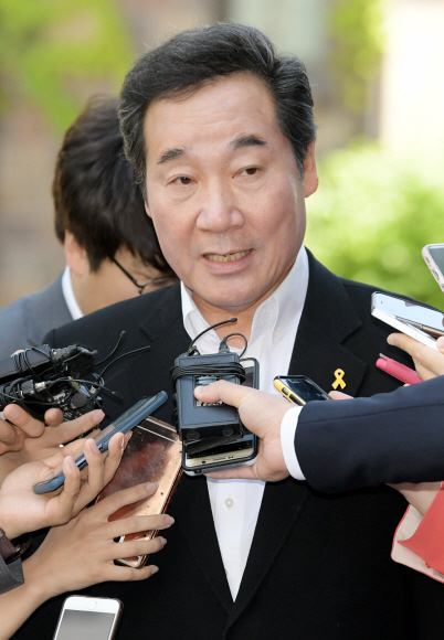 이낙연 국무총리 후보자가 14일 오후 본격적으로 청문회 준비를 위해 서울 종로구 통의동 금융감독원 연수원에 마련된 사무실에 출근하며 기자들의 질문에 답하고 있다. 이종원 선임기자 jongwon