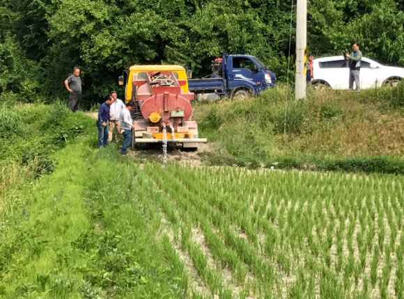 전북 진안군이 22일 지속된 가뭄으로 논바닥이 갈라지는 등 영농에 어려움을 겪고 있는 진안읍 반월리 외기마을 4200여㎡ 논에 급수차를 동원해 물을 대고 있다. 이 지역은 농업 용수원에서 멀리 떨어져 있어 양수 장비를 이용하기가 어려운 곳이었는데, 급수차로 물을 공급받아 다행히 고사하는 모를 살릴 수 있었다.