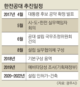 이런 가운데 한전공대 설립은 지난 대선에서 지역공약으로 채택됐다. 시·도는 최근 한전공대 설립이 포함된 에너지밸리 조성 사업에 실무적으로 대응하기 위해 정책협의체를 구성했다. 또 다음달부터는 한전이 참여하는 에너지 밸리 정책협의회를 정례화한다.