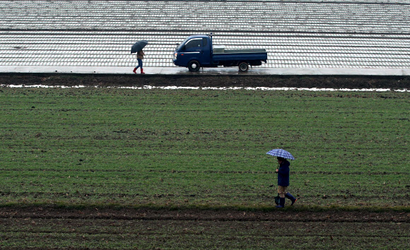 전남 지역에 겨울 가뭄이 이어지는 가운데 16일 전남 강진군 군동면에 단비가 내리자 농부들이 생육이 부진한 마늘 밭을 살펴보고 있다.