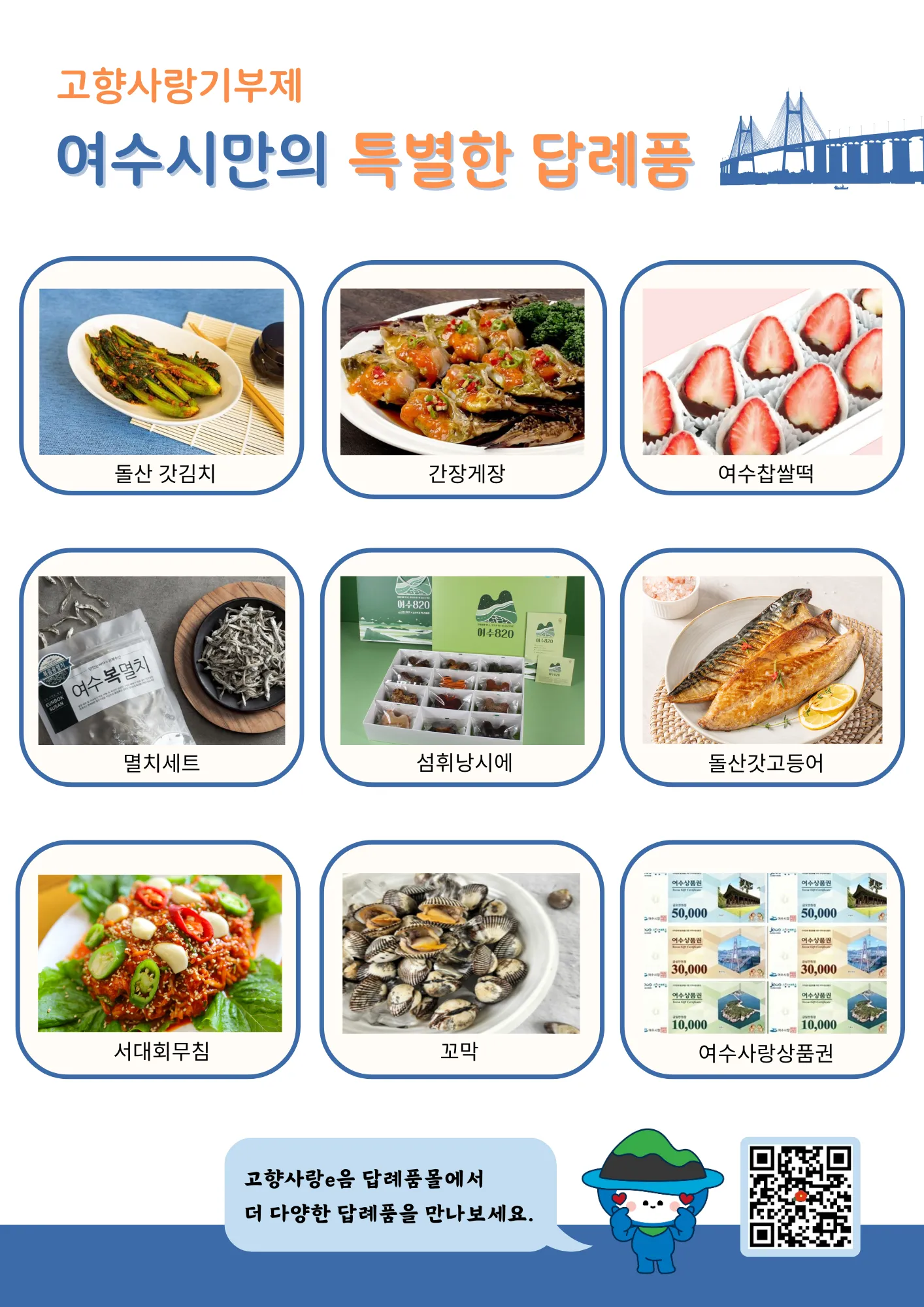 여수시는 지난해 지역축제 등 주요 행사와 여수국가산업단지 입주업체, 출향인 등을 대상으로 찾아가는 고향사랑기부제 홍보 활동을 펼쳐 기부자들의 적극적인 참여를 이끌었다. 특히 여수 대표 특산물인 갓김치와 간장게장, 멸치 등 지역 특산물과 여수상품권 등 다양한 답례품이 기부자들에게 큰 호응을 얻었다.