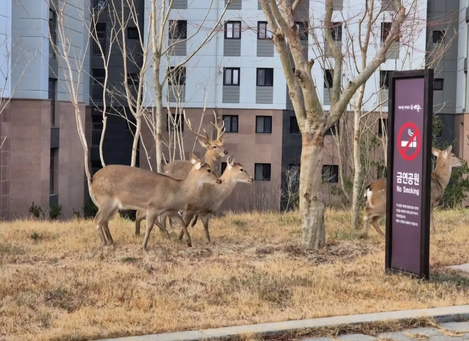 전남 순천시는 2010년대 초반 농장에서 탈출한 사슴 4마리가 도심 산인 봉화산에서 번식하면서 개체 수가 60∼70마리로 늘어 아파트단지에까지 출몰해 대책을 고심하고 있다고 3일 밝혔다. 사진은 한 아파트단지에 나타난 사슴 떼.