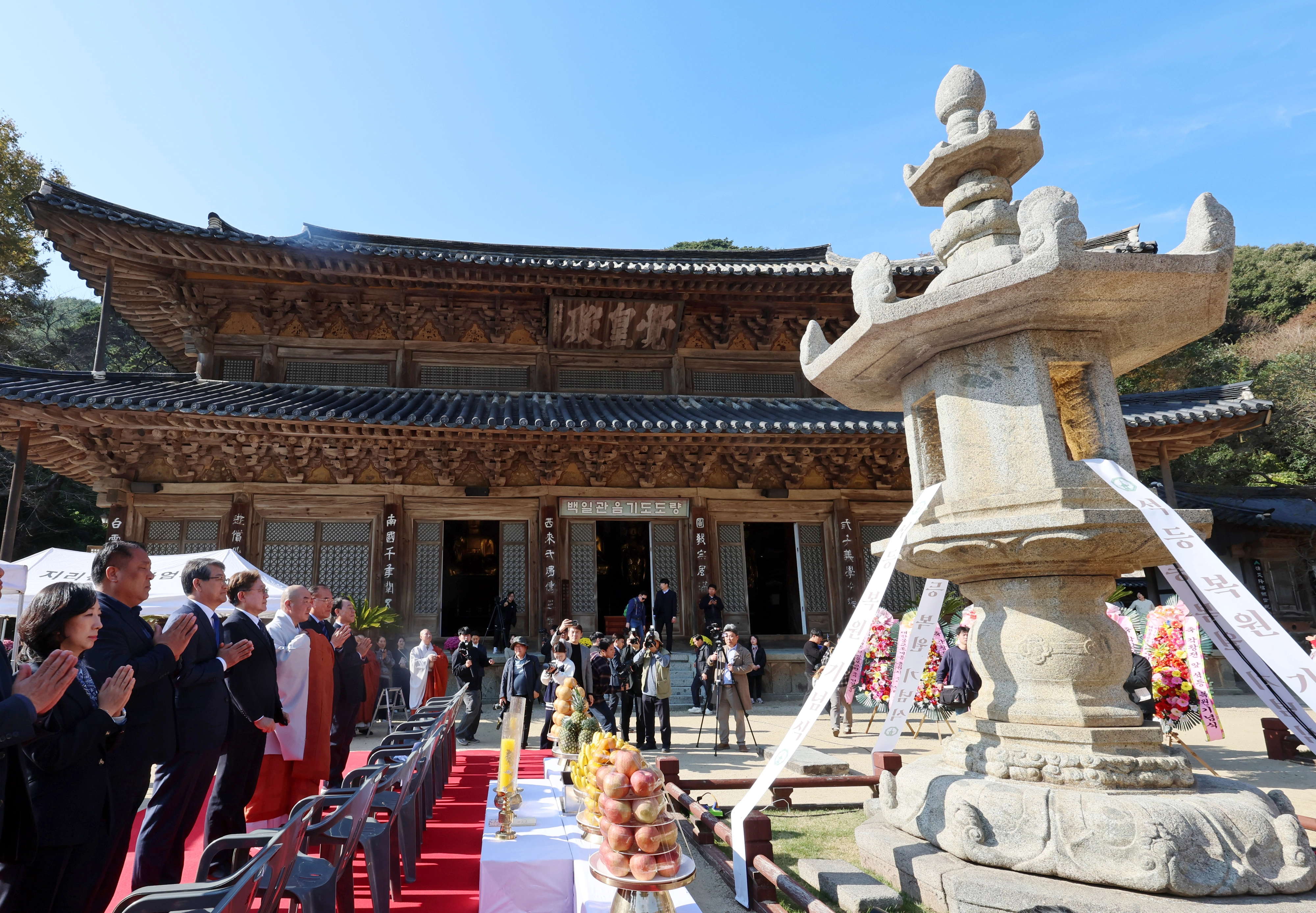 5일 전남 구례 화엄사에서 국보 12호인 각황전 앞 석등 복원 기념식이 열리고 있다. 국가유산청 국립문화유산연구원은 국보인 석등에서 균열과 파손이 확인되자 2023년 5월 부분 해체 보수를 시작했고, 2년 6개월 만에 복원 공사를 마무리했다. 9세기에 제작된 것으로 추정되는 석등은 높이 6.4m로 우리나라에 남은 석등 중 가장 큰 규모다. 연합뉴스