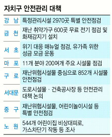 23일 각 자치구에 따르면 최악의 참사를 빚은 세월호 침몰 사고를 계기로 재난대응 체계 점검뿐 아니라 붕괴 위험이 큰 위험시설물 자체 조사 등 안전관리에 발 빠르게 움직이고 있다.