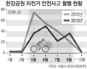이에 따라 자전거 안전사고도 빈번해졌다. 최근 2년간 자전거 안전사고는 초여름 또는 여름휴가철 전후에 더욱 집중되는 경향을 보였다. 올해 본부에 접수된 자전거 안전사고는 1월엔 한 건도 없었지만, 꾸준히 증가해 5월과 6월에는 각각 37건이 발생한 것으로 나타났다.