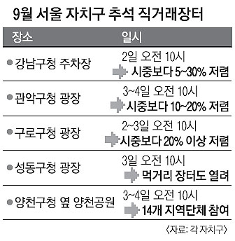 강남구는 다음달 2일 오전 10시부터 오후 7시까지 구청 주차장에서 시중보다 5~30% 싼값으로 150개 품목의 농수축산물을 파는 직거래장터를 연다고 27일 밝혔다. 현장 택배 서비스를 운영하고 3만원 이상 구매 고객 1000명에게는 쌀 500g을 무료로 나눠 준다. 관악구도 다음달 3~4일 구청 광장에서 100여개 제수용품을 시중보다 10~20% 정도 저렴하게 파는 장터를 마련한다. 구로구는 구청 광장에서 다음달 2~3일 오전 10시부터 오후 5시까지 직거래장터를 열고 20개 지역의 물건을 팔도록 한다. 상인들과 20% 이상 저렴하게 팔기로 합의했다. 성동구는 다음달 3일 오전 10시 구청 앞 광장에서 무지개 나눔장터를 연다. 먹거리장터를 함께 운영하는 게 특징이다. 또 다음달 추석연휴(5~10일) 기간에는 293곳의 거주자·공영 주차장을 무료로 개방한다. 영등포구는 지난 26일 오전 9시부터 오후 6시까지 구청 앞마당에서 직거래장터를 열었다.