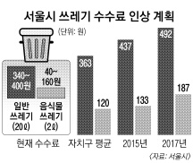 서울의 일반 쓰레기봉투 가격은 20ℓ 기준으로 평균 363원이다. 이는 전국 평균 457원의 80% 수준, 광역시 평균 650원의 58% 수준이다. 서울연구원에 따르면 서울의 쓰레기 처리비용 수수료의 원가율이 일반은 55%, 음식물 쓰레기는 39%인 것으로 나타났다. 시 관계자는 “1995년 쓰레기 종량제 도입 후 현재까지 쓰레기 봉투 가격이 사실상 동결됐다”면서 “이로 인해 자치구의 재정부담이 해마다 늘어왔다”고 설명했다. 쓰레기 종량제 수수료 인상으로 확보되는 재원은 노후 청소 차량과 적재시설 개선에 쓰인다.