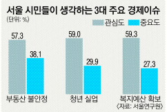 서울 시민들은 올해 가장 중요한 경제 이슈로 ‘부동산 불안정’을 꼽았다. 특히 10명 중 9명은 올해도 소득 양극화 문제가 개선되지 않을 것으로 예상했다. 8일 서울연구원 서울경제분석센터가 지난해 4분기 시내 1000가구를 대상으로 설문한 내용을 분석한 결과 서울시민이 중요하게 생각하는 3대 경제 이슈는 부동산 불안정, 청년실업, 복지예산 확보 등이었다.
