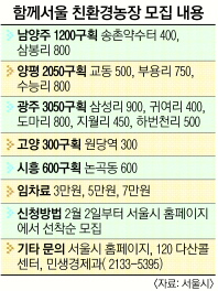 서울시는 시가 운영하는 ‘함께서울 친환경농장’ 참여자를 다음달 2일 오전 9시부터 홈페이지(www.seoul.go.kr)를 통해 모집합니다. 농장을 분양받으면 합성 농약이나 화학비료를 사용하지 않고 손수 농작물을 경작할 수 있습니다. 시는 농작물 재배시기에 맞춰 씨앗, 유기질 비료, 방제제 등을 무료로 지원합니다. 현장에서 재배방법도 가르쳐준다고 하네요.