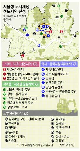 시는 9일 ▲쇠퇴·낙후 산업지역 3곳 ▲역사·문화자원 특화지역 7곳 ▲저이용·저개발 중심지역 5곳 ▲노후 주거지역 12곳 등 27곳을 도시재생 선도지역으로 선정했다고 밝혔다.