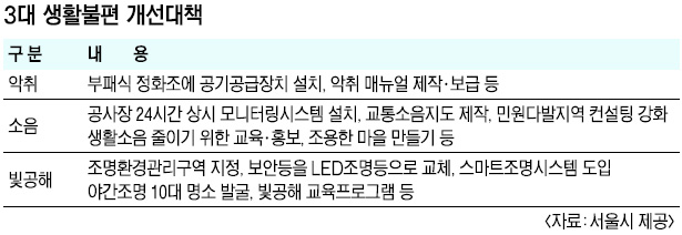 서울시가 악취 문제를 해결하기 위해 모든 부패식 정화조에 공기공급장치를 설치한다. 소음 민원의 79.1%를 차지하는 공사장에 24시간 소음 측정 시스템을 구축하고 빛공해를 줄이기 위해 2017년까지 보안등을 발광다이오드(LED) 조명등으로 100% 교체한다.