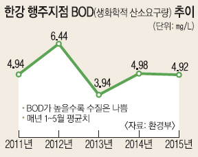 녹조를 제외해도 한강 수질은 더 좋아지지 않고 있다. 한강 하류인 행주 지점의 매년 1~5월 평균 생화학적 산소요구량(BOD)을 볼 때 ℓ당 2012년 6.44㎎에서 2013년 3.94㎎로 떨어졌지만 올해 4.92㎎로 오른 상태다. BOD가 높을수록 수질이 좋지 않다는 의미다. 수치가 높을수록 맑은 물을 의미하는 용존산소량(1~5월 평균)도 ℓ당 2011년 13.44㎎에서 2013년 12.64㎎로 떨어졌고 올해는 11.46㎎으로 더 낮아졌다.