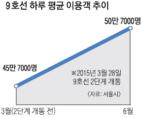 9호선의 하루 평균 이용객도 2단계 개통 전 45만 7000명에서 지난달에는 50만 7000명으로 5만명(11%) 증가했지만 이번달에는 49만명으로 다시 줄어드는 추세다.