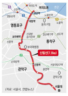 시는 신림선 경전철 사업시행자인 남서울경전철과 실시협약을 맺고 연말에 사업을 시작한다고 12일 밝혔다. 신림선은 서울대 앞에서 시작해 신림역과 보라매공원, 대방역을 지나 여의도동 샛강역까지 이어지는 노선으로 총연장 7.8㎞이며 지하구간에 정거장 11곳과 차량기지 1곳이 건설된다. 사업비는 5606억원이고 이 중 50%는 남서울경전철이 부담한다.