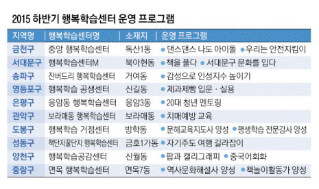 행복학습센터는 박근혜 정부 국정과제 중 하나인 ‘평생교육 활성화’를 위해 시 평생교육진흥원이 운영하는 동(洞) 단위 학습센터다. 거시적이고 추상적인 개념이었던 평생교육을 지역민의 실생활 속으로 끌어들여 누구나 근거리 생활권에서 학습에 참여할 수 있는 기회를 제공한다.