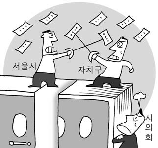 시와 자치구의 재원 다툼을 지켜보는 서울시의원들의 심정은 복잡하다. 한 시의원은 “지역에 기반을 둔 탓에 조정교부금 확대를 대놓고 반대하기는 어렵지만 조정교부금이 자치구로 흘러가는 것이 탐탁지만은 않다”고 했다. 시의원은 자치구 사업이 늘어나는 것보다 시 사업을 따내 자치구로 들고 내려가야 유권자들에게 업적으로 평가받기 때문이다. 현재는 ‘내가 유치했다’고 자랑할 건수가 없다.