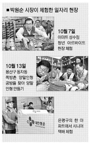 박 시장은 지난 7일부터 현장의 어려움을 듣고 일자리 창출 방안을 마련하고자 한 달간의 일자리 대장정을 시작했다. 그동안 청년 아르바이트생, 쪽방촌 주민, 소상공인 등 다양한 계층의 생생한 목소리를 들었다. 웃고 울고 때로는 쓴소리도 들었다. ‘우리의 얘기를 들어주는 것만으로 가슴이 후련하다’는 반응도, ‘실적보다 진심을 보여 달라’는 요청도 있었다. 그중 박 시장과 참석자 모두의 가슴을 뜨겁게 했던 순간은 지난 12일 진행됐던 ‘직장맘과 함께하는 저녁식사’였다. 당시 출산을 장려하는 정부 정책과 달리 육아휴직을 신청하면 사직서를 종용받는 직장 엄마들의 고충이 쏟아져 나왔다. 박 시장은 이날 이동하는 버스 안에서 “시 직장맘지원센터에 가면 상담실마다 사각티슈가 놓여 있다. 엄마들이 얘기 도중 많이 울기 때문”이라면서 “아기를 낳는 게 죄악처럼 여겨지는 인식을 조금이라도 바꿀 수 있도록 힘껏 지원할 계획”이라고 강조했다. 시는 그동안 나온 일자리 현장의 얘기들을 실질적인 정책에 반영해 나갈 방침이다.