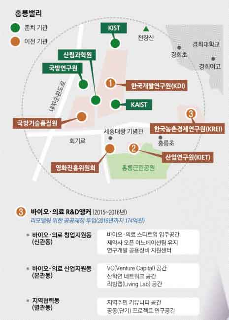박 대통령은 ‘바이오·기후변화 신기술 및 신산업 창출전략 보고회’를 겸한 지난해 7월 회의에서 홍릉단지 활성화를 위한 계획 수립도 지시했다. 현재 지방으로 이전한 KDI, 한국농촌경제연구원, 산업연구원 건물은 빠르면 2017년 1월 개관을 목표로 리모델링이 진행 중이다. 옛 국방기술품질원 건물은 방위사업청이, 영화진흥위원회는 수림문화재단이 관리하고 있다.